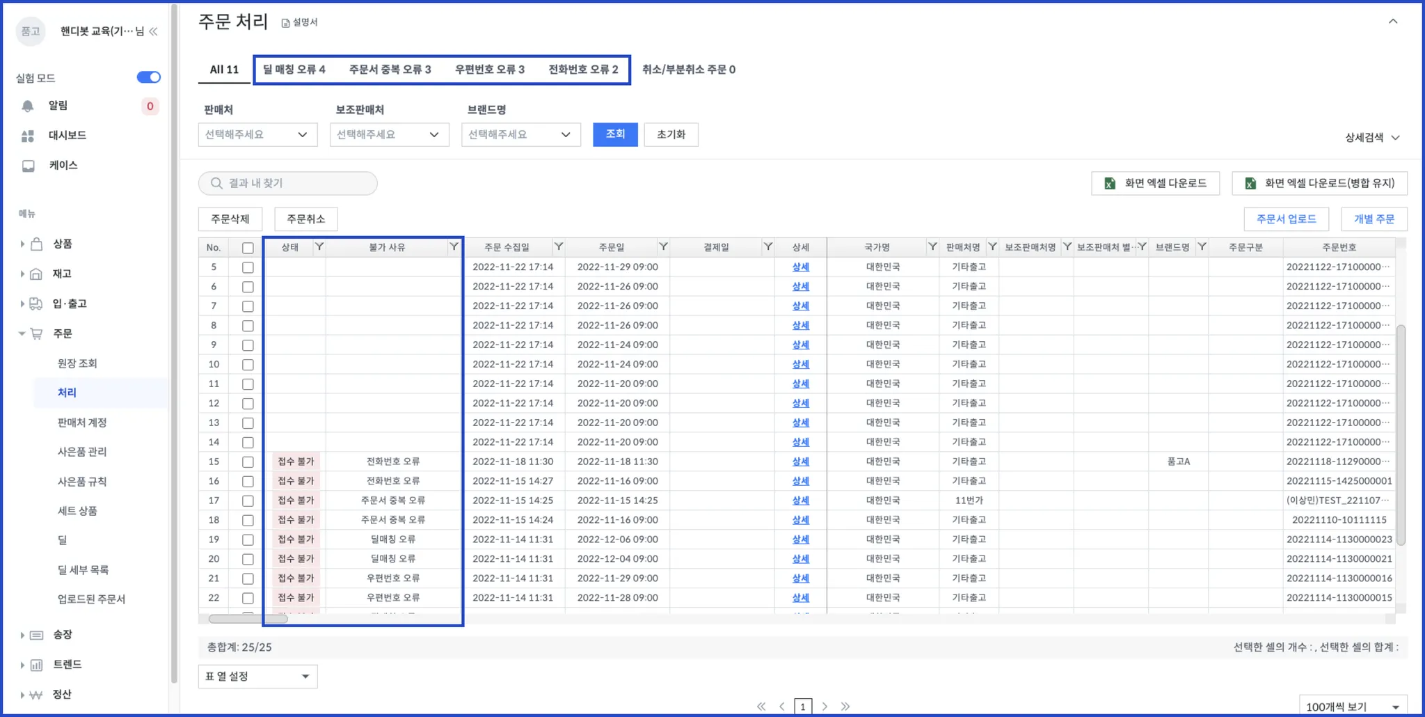 불가 사유 칼럼을 확인하고, 각 탭에서 오류를 해결