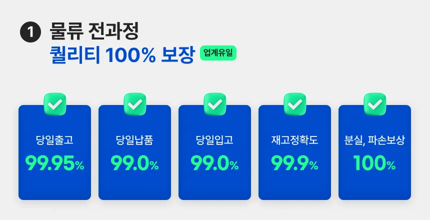 업계 유일 5대 약속 보상제물류에서 가장 중요한 5가지 부문에서 100%의 문제 해결율을 자랑해요. 당일 입출고는 물론 4시 이전 입고 상품의 당일 납품, 재고정확도와 분실 및 파손보상까지 완벽에 준하는 달성으로 판매자분들은 믿고 맡기실 수 있어요. 심지어 네이버 도착보장 주문 건의 당일 미출고 시 1,000원의 네이버 포인트를 상품 구매자에게 지급해 고객 경험까지 신경쓰고 있답니다.